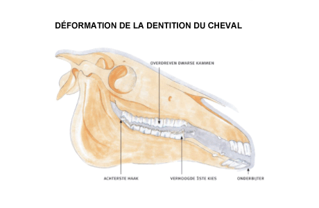 Un placement incorrect d'une dent, une dent fracturée, des points d'émail tranchants et les blessures associées de la muqueuse de la langue et de la joue, peuvent entraîner une mastication inefficace, une usure incorrecte des autres dents, de la protestation contre le mors et même la perte d'une ou plusieurs dents. Les chevaux ne présentent pas de symptômes à un stade précoce, donc sans un contrôle régulier, votre cheval peut développer des troubles dentaires graves, une perte de performance, une perte de poids, ... Un examen dentaire annuel est fortement conseillé, et certains chevaux en ont besoin encore plus souvent. Un examen dentaire complet et un traitement doivent être effectués par un spécialiste et sous sédation.